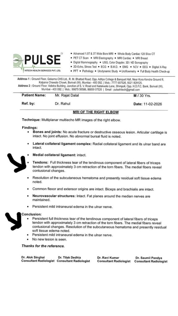 वीडियो में रजत दलाल ने बताया, “सभी को राम-राम… सब लोग पूछ रहे हैं कि आखिर मुझे हुआ क्या है। तो The 50 के पहले दिन के शूट के दौरान ही मेरा टेंडन टियर हो गया था। शुरुआत में करीब 2.8 सेंटीमीटर का टियर था, लेकिन जब मैंने टास्क परफॉर्म किया तो ये बढ़कर 3 सेंटीमीटर हो गया।” रजत ने आगे बताया कि उस समय सर्जरी ही इसका एकमात्र इलाज था, लेकिन शो की कमिटमेंट की वजह से उन्होंने इसे टाल दिया। उन्होंने कहा, “शो की कमिटमेंट थी और मेरा भी शो छोड़ने का मन नहीं था। इसलिए मैंने पहले शो पूरा किया और उसके बाद डॉक्टर से सर्जरी की तारीख ली।”