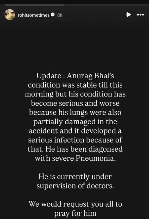अनुराग के मैनेजर रोहित के मुताबिक, सुबह तक उनकी हालत स्थिर थी, लेकिन बाद में अचानक उनकी तबीयत बिगड़ गई। उन्होंने बताया कि दुर्घटना में अनुराग के फेफड़ों को काफी नुकसान पहुंचा है, जिसके कारण उन्हें संक्रमण हो गया है। रोहित ने कहा कि फेफड़ों के प्रभावित होने की वजह से उन्हें निमोनिया भी हो गया है। फिलहाल डॉक्टर उनकी हालत पर लगातार नजर रखे हुए हैं और अस्पताल में उनका इलाज जारी है। परिवार और टीम ने प्रशंसकों से उनके जल्द स्वस्थ होने की प्रार्थना करने की अपील की है।
