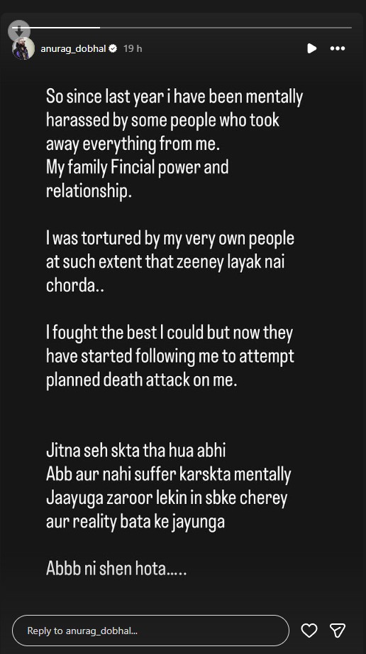 अनुराग ने अपनी इंस्टाग्राम स्टोरी में दावा किया कि पिछले एक साल से कुछ लोग उन्हें मानसिक रूप से प्रताड़ित कर रहे हैं। उन्होंने लिखा कि उनसे उनका परिवार, आर्थिक ताकत और रिश्ते छीन लिए गए। “मेरे अपने लोगों ने मुझे इस हद तक टॉर्चर किया कि जीने लायक नहीं छोड़ा,” उन्होंने पोस्ट में कहा।