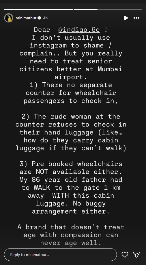 उन्होंने लिखा कि इंडिगो को मुंबई एयरपोर्ट पर बुजुर्ग यात्रियों के साथ व्यवहार में सुधार करना चाहिए। मिनी माथुर के अनुसार, एयरपोर्ट पर व्हीलचेयर यात्रियों के लिए कोई अलग चेक-इन काउंटर मौजूद नहीं था। इसके अलावा, काउंटर पर मौजूद एक महिला स्टाफ ने व्हीलचेयर पर बैठे यात्रियों का हैंड लगेज चेक-इन करने से भी मना कर दिया। मिनी ने सवाल उठाया कि जब कोई व्यक्ति चल भी नहीं सकता, तो वह केबिन लगेज कैसे संभालेगा। सबसे गंभीर आरोप यह था कि पहले से बुक की गई व्हीलचेयर भी उपलब्ध नहीं कराई गई।