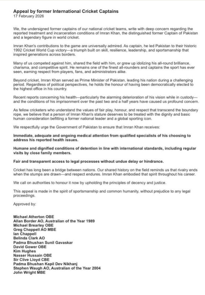 17 फरवरी को जारी इस बयान में कहा गया कि जेल में रहते हुए इमरान खान की दृष्टि में तेज गिरावट की खबरें और पिछले ढाई वर्षों से उनकी हिरासत की परिस्थितियां गंभीर चिंता का विषय हैं। पूर्व कप्तानों ने इन रिपोर्ट्स पर गहरी चिंता जताई है। इस संयुक्त अपील पर हस्ताक्षर करने वालों में Michael Atherton, Allan Border, Michael Brearley, Greg Chappell, Ian Chappell, Belinda Clark, David Gower, Kim Hughes, Nasser Hussain, Clive Lloyd, Stephen Waugh और John Wright जैसे नाम शामिल हैं।